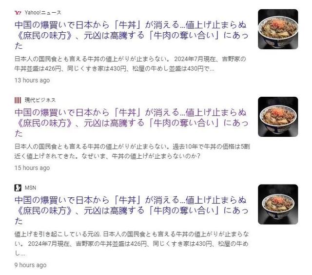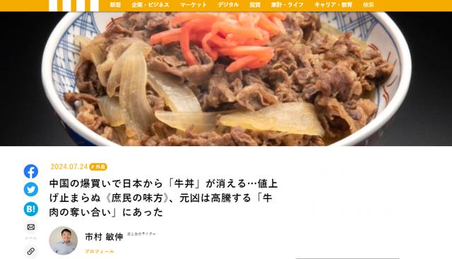 24日,日本“现代商业”新闻网发布了一篇报道,题为《中国爆买导致日本牛肉饭消失》,称由于中国大量采购牛肉,导致吉野家等知名餐厅的牛肉饭大幅涨价,日本民众难以消费这一昔日的“国民美食”。