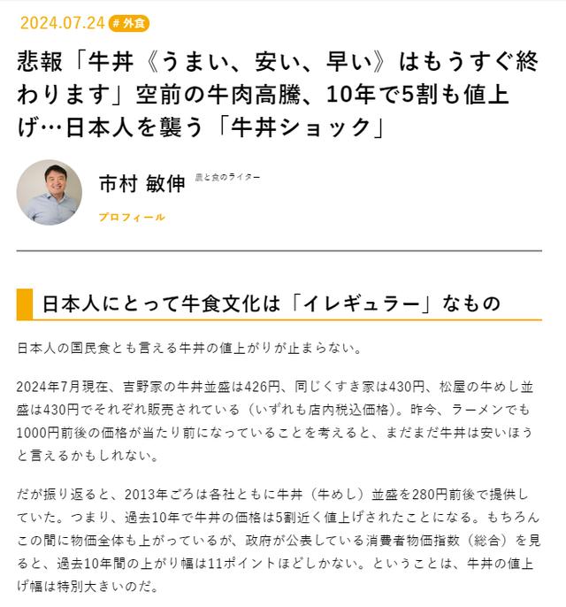 据作者介绍,自2013年至2024年7月,日本吉野家等知名连锁餐厅的牛肉饭价格从280日元涨至426日元(约合人民币20元)。此前,这类牛肉饭因物美价廉被日本工薪阶层称为“国民美食”、“庶民之友”,因此其涨价引发了日本民众的广泛关注。