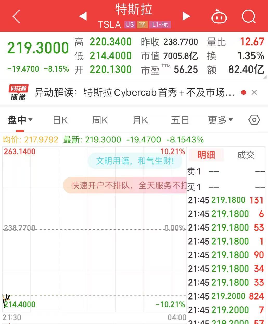特斯拉下跌8.15%,市值蒸发622.07亿美元(约合人民币4395.09亿元)。