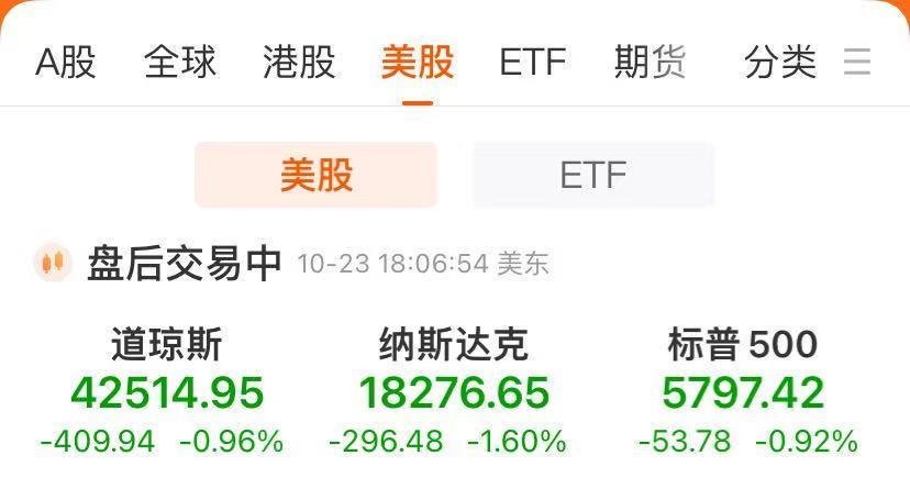 截至收盘,道琼斯指数跌0.96%,报42,514.95点;标普500指数跌0.92%,报5,797.42点;纳斯达克指数跌1.60%,报18,276.65点。