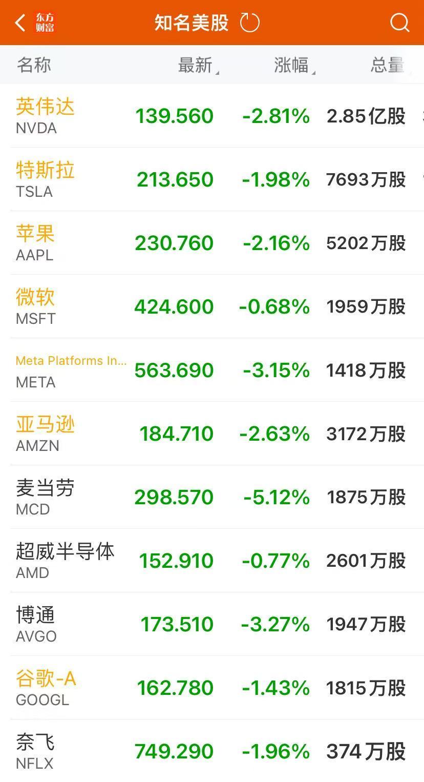 大型科技股全线下跌,苹果跌2.16%,微软跌0.68%,英伟达跌2.81%,谷歌跌1.43%,亚马逊跌2.63%,Meta跌3.15%,特斯拉跌1.98%。