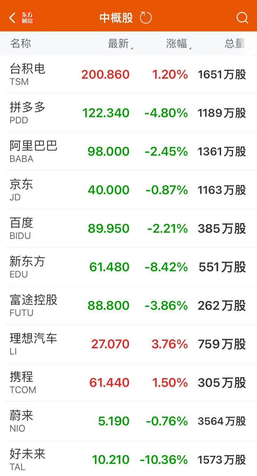 热门中概股多数下跌,纳斯达克中国金龙指数跌1.20%,阿里跌2.45%,京东跌0.87%,拼多多跌4.80%,蔚来跌0.76%,小鹏汽车涨1.09%,理想汽车涨3.76%,哔哩哔哩跌0.49%,百度跌2.21%,网易跌1.22%,腾讯音乐跌1.78%,爱奇艺跌1.94%。