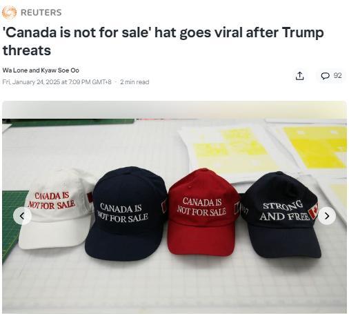 穆尼指出,此前,安大略省省长福特在渥太华与加拿大总理特鲁多及其他省长会面时,戴上这顶印有“加拿大是非卖品”字样的帽子。自那时起,已有数以万顶这样的帽子在网上被订购。