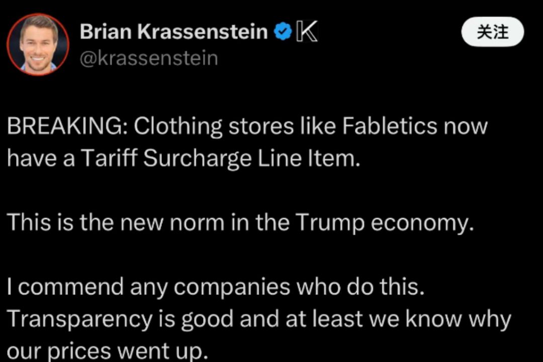 这张小票在社交网站被大量转发。有人称,商家把关税附加费项目透明化是件好事,“至少我们知道价格上涨的原因”……