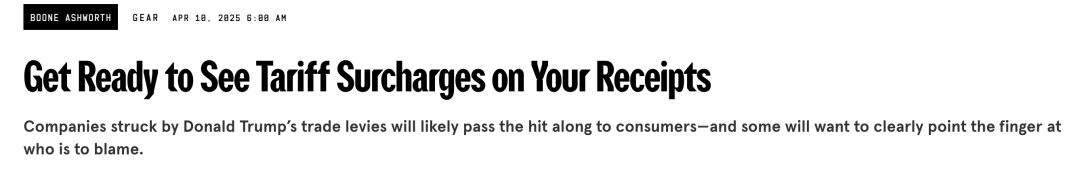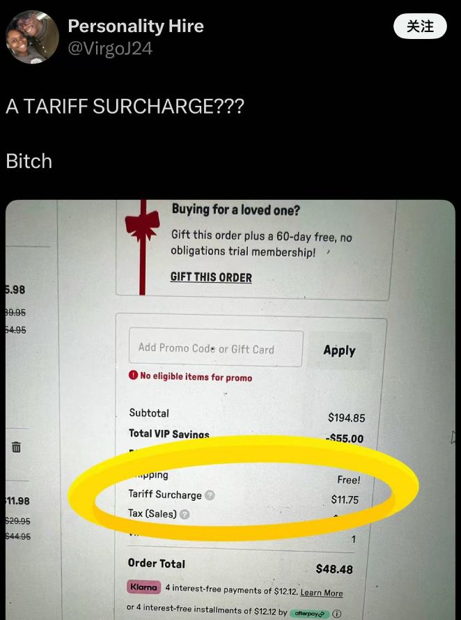 这位母亲查询发现,这笔费用是服装零售商根据产品各部分的生产地区,乘以美国政府对各国加征的关税税率计算出来的一笔费用,零售商将这些成本命名为“关税附加费”后转移给了美国消费者。