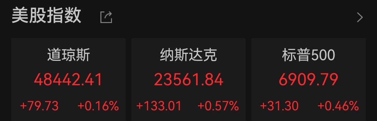 中新经纬12月24日电 美东时间周二,美国三大股指均录得四连涨,标普500指数创收盘新高。截至收盘,道指涨0.16%报48442.41点,纳指涨0.57%报23561.84点,标普500指数涨0.46%报6909.79点。