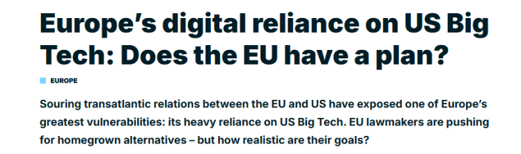 报道分析认为,对于少数几家供应商的依赖使得欧盟在公共和私营部门都面临着巨大的主权风险,以至于任何技术问题、地缘政治争端或恶意行为都可能产生广泛而灾难性的后果。