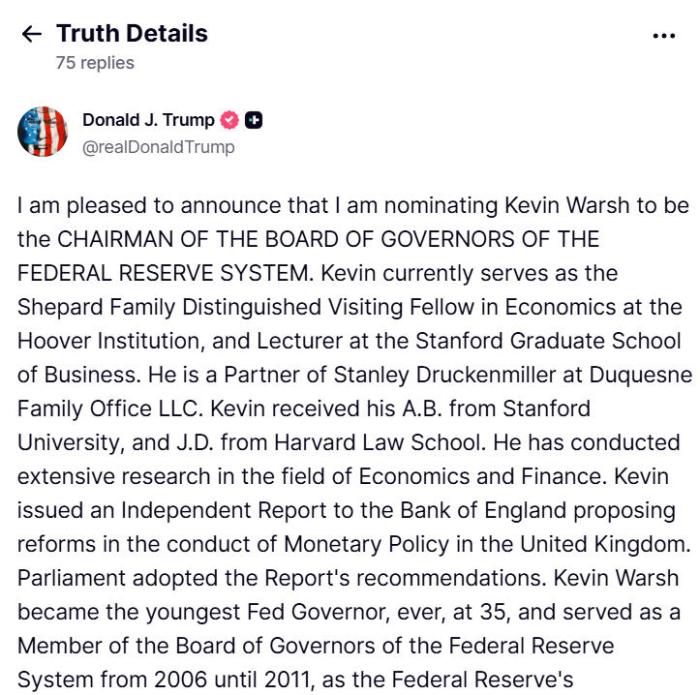 中新网1月30日电 据外媒报道,美国总统特朗普当地时间30日在社交媒体上宣布,提名凯文·沃什担任美联储主席。