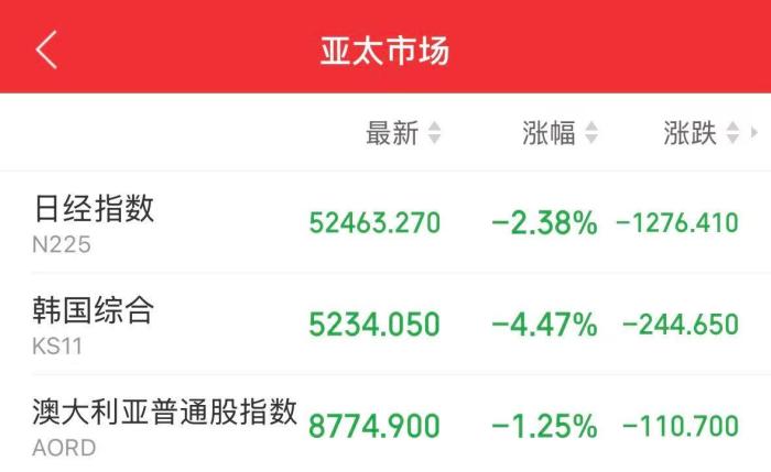 2日,日韩股市盘中迅速走低,韩国交易所还启动KOSDAQ指数熔断机制,最终集体大幅收跌,日经225指数跌超2%;韩国综合指数跌超4%。美欧股市虽还未开盘,但美欧股指期货亦集体下挫。