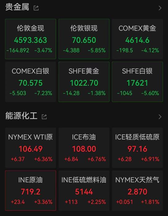 国际油价则大幅走高,截至发稿时,WTI原油和布伦特原油均涨超6%,布伦特原油站上108美元/桶。