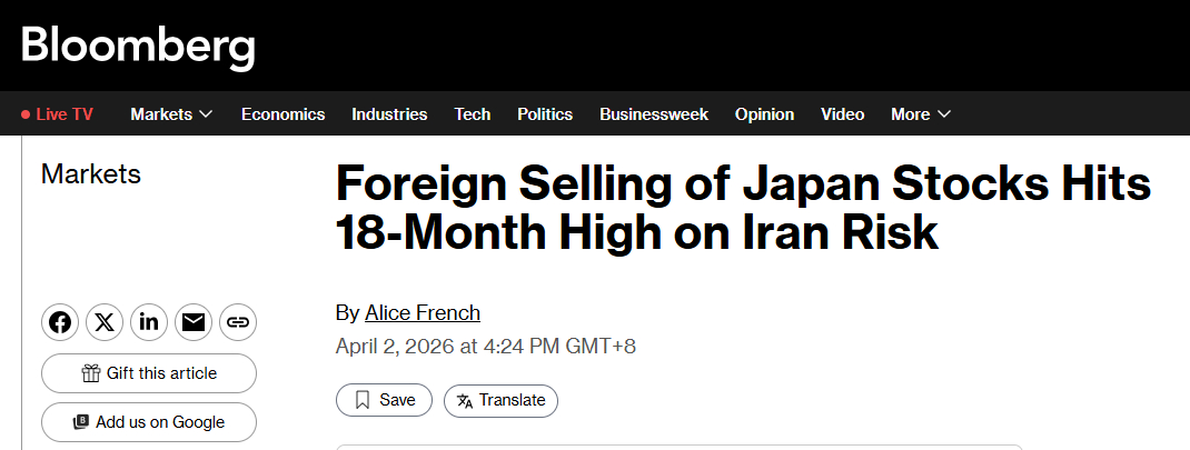 中新经纬4月2日电 据彭博社2日报道,上周,外国投资者抛售日本股票的数量创下自2024年9月以来的最高水平,这再次表明市场日益担忧美以伊局势对亚洲经济的影响。