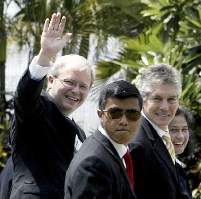 此次巴厘岛之行也是陆克文第一次以总理身份出访。他抵达后的第一项安排便是与东道主印尼总统苏西洛会谈。会谈后,陆克文表示,他将在明年7月收到澳大利亚政府支持的经济学家罗斯?加诺特的相关气候报告后,再考虑设立减排目标。“我明白很多问题还在讨论之中。”他说,“起点,当然,是我们尊重和接受科学家的工作。”
