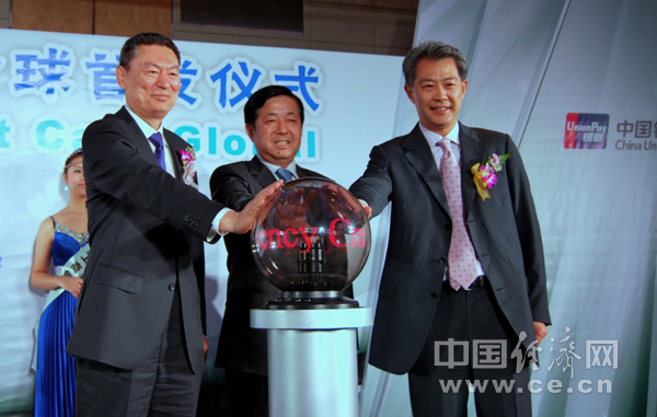 魏苇大使(中)与苏宁董事长(左)、李晓鹏副行长共同启动双币卡首发仪式。中国经济网陶杰/摄