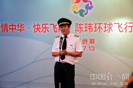 中国经济网北京7月14日讯(记者李晶晶) 13日下午,中国侨联在北京举办“亲情中华·快乐飞翔”陈玮环球飞行活动欢迎仪式,祝贺旅美华侨陈玮顺利抵达北京。陈玮驾驶单引擎轻型飞机,从美国出发,一路向东,开始环球飞行。他将成为全世界第167位实现环球飞行的人,这是中国人第一次驾驶飞机环球飞行,也是世界环球史上第一次穿越中国领空的环球飞行。