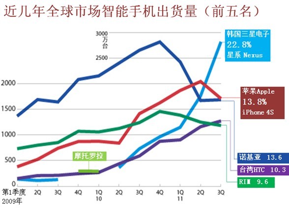全球智能手机市场上,美国苹果和韩国三星在争夺首位,紧随其后的是芬兰诺基亚、台湾HTC和美国RIM,日本方面则稍显落后。