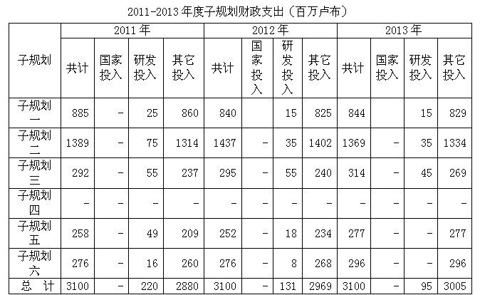《信息社会(2011-2020)》规划的任务主要通过规划当中的六个子规划来体现。子规划具体名称为:《信息社会居民生活质量和商业发展水平》、《电子政务和国家管理的效力》、《俄罗斯信息和通讯技术市场》、《信息社会基础设施》、《信息社会安全》、《数字转换和文化遗产》。2015年是俄罗斯《信息社会(2011-2020)》规划实施的考核年,在规划中也对六个子规划的近期财政支出列出了明确的指标,具体数额见表1。