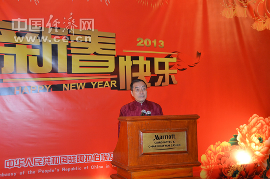 宋大使首先向生活和工作在埃及的华人华侨拜年,恭祝大家新春快乐,身体健康,阖家幸福,万事如意!回顾过去一年,宋大使表示,2012年是中国发展进程中具有重大和深远意义的一年,也是中埃两国关系继往开来,各领域合作取得丰硕成果的一年,两国政治、经贸关系继续推进、深入发展,开启了中埃友好合作的新篇章。展望即将到来的农历蛇年,宋大使指出,希望大家在新的一年里继续发扬爱国爱乡的优良传统,继续为祖国的繁荣富强和统一大业,为中埃关系的不断发展作出新的更大贡献。