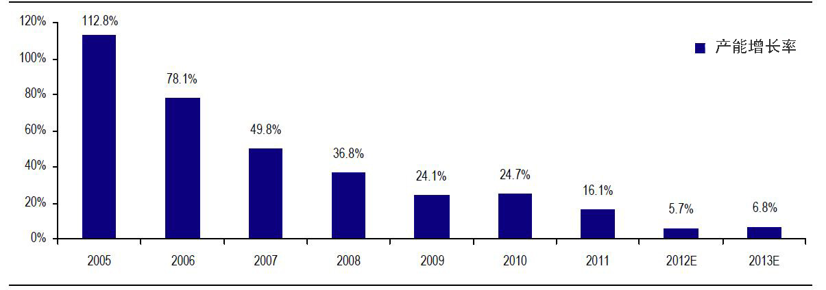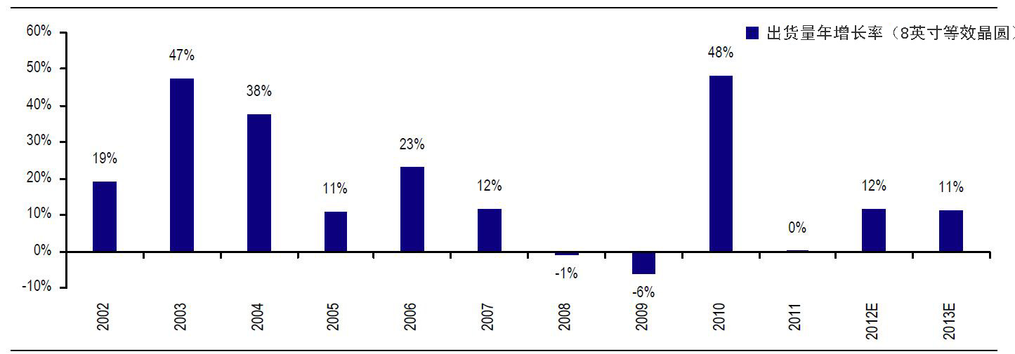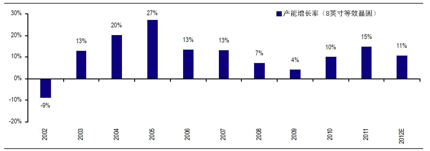 瑞银预计2012年和2013年亚洲晶圆企业产能的年均增长率为11%,低于2011年的15%,基本与2002年后的平均值相当。