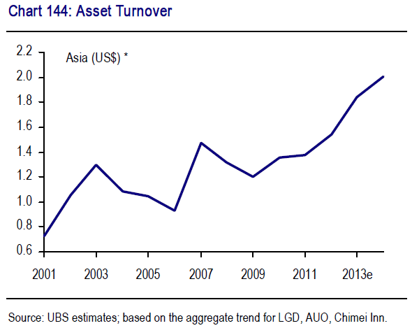 瑞银还预测,在未来两年间,亚洲LCD行业销售额将增长13%,但固定资产预计将减少13%。到2014年末,资产周转水平将提高25%(从目前的1.5x到2x)。明年,LCD的价格不会发生显著上涨。