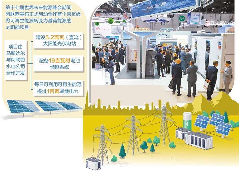 贾比尔表示,从全球最大的单个太阳能发电站到世界领先的海水淡化厂,从在海面上低速运行的风电场到巴拉卡核电站4个机组全面投入运行,阿联酋已经成为全球能源转型的标杆之一。贾比尔宣布正式启动全球首个吉瓦级将可再生能源转变为基荷能源的太阳能项目。该项目由马斯达尔与阿联酋水电公司合作开发,将建设5.2吉瓦(直流)太阳能光伏电站,并配备19吉瓦时电池储能系统,每日可利用可再生能源提供高达1吉瓦的基载电力,确保全年全天候提供可靠的能源供应,该项目建成后将成为全球最大的太阳能与电池储能系统结合的设施。