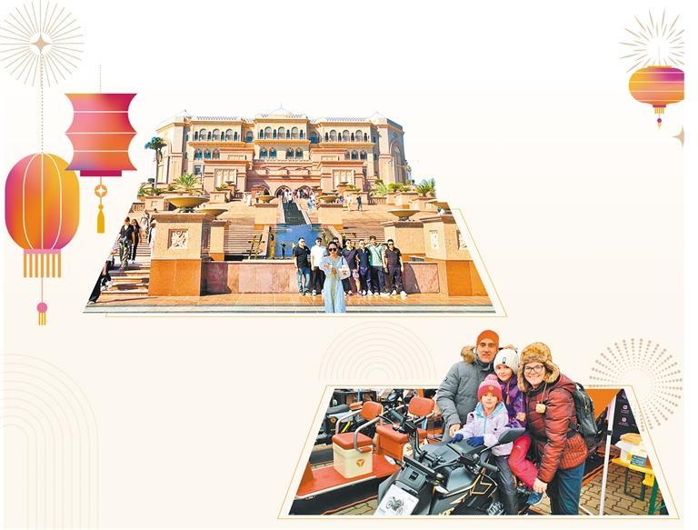 (左上) 近年来,随着中国游客出境游热度持续恢复,阿联酋越来越受到中国游客的关注与青睐。每逢春节长假,众多中国游客来到阿联酋,与当地华人华侨一同参与丰富多彩的游乐活动,欢度新春佳节。阿布扎比酋长宫殿酒店是阿联酋著名的旅游景点,也是中国游客必游之地。图为中国游客在酒店前“打卡”留念。本报记者 李学华摄
