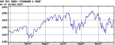 从上图可以看出,2007年美国股市整体上仍然保持着震荡上行的走势,全年主要经历了三次比较明显的下跌。一次发生在2月底3月初,主要是受到了2-27全球股市大跌的影响,日元加息导致日元套利平仓是背后的主要原因。第二次下跌发生在7月底至8月中旬,这次下跌主要是受到了次贷危机的冲击,下跌幅度超过了2-27大跌。第三次下跌发生在11月份,原因同样是受到次贷危机冲击,市场担心次贷危机会愈演愈烈,而美联储的降息幅度又没有达到华尔街的预期,因此再次出现下跌。这次下跌的幅度与7月份基本相似。