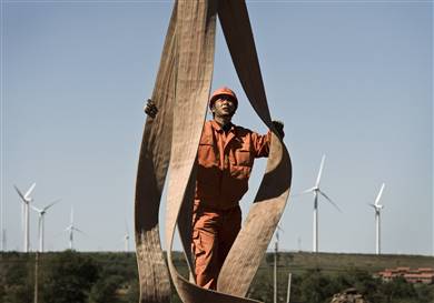 图片说明:一名工人正在安装风力涡轮机,目前中国能源需求的80%的都来自煤炭。