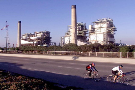 图片说明:两名骑车者从爱依斯电力公司(AES Corp)位于Huntington海湾的发电厂前经过,这家美国老牌电力公司已经将15.8%股份出售给中国投资有限责任公司。