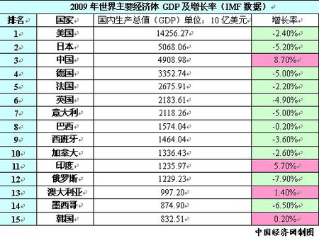 经历了2009年第一季度大幅下滑、第二季度降速放缓之后,世界经济复苏势头在第三季度开始显现。数据显示,去年第三季度,美国结束了连续5个季度环比负增长的局面,GDP增长率达2.8%;日本也结束了连续4个季度的负增长,二、三季度分别增长0.7%和1.2%。欧元区结束了连续5个季度的负增长,三季度增长0.4%。2009年全球主要经济体GDP数值及增长率可以参见下表: