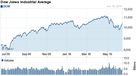 股市大涨后回吐 未来数月或下跌20% 今年一季度纽约股市股指涨幅创下12年来同期之最。最能代表市场趋势的标准普尔500指数一季度上涨约5%,为近十二年来同期涨幅最大。三大股指在连续八周上涨后,在4月下旬一起创下了本轮牛市的新高。但5月开始股市急转之下。5月6日美国股市经历了历史上最动荡的一天,纽约股市大跌,其中道琼斯指数在不到半小时内跌幅达到近1000点,这是该指数有史以来最大的单日跌幅。到5月20号,美国接连公布的就业市场等的一系列数据不及预期后,迅速将市场的信心一举击垮,当日道指收于10068.01点,纽约股市三大股指与一个月前创下的反弹高点相比下跌10%以上,全部回吐2010年以来的所有涨幅,陷入本轮牛市以来第一次真正技术意义上的“回调”。截至到6月16日道琼斯30种工业股票平均价格指数收于10404.77点。标准普尔500种股票指数收于1115.23点。纳斯达克综合指数收于2305.88点。 参见下图: