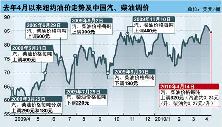 2009年3月---2010年4月国际油价及中国汽、柴油价走势图