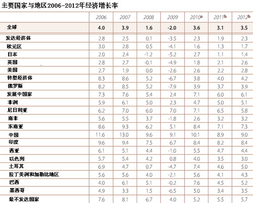 联合国经社理事会在12月1日发表的《2011年世界经济形势与展望》报道中指出,世界经济正在从“衰退”走向复苏但进展缓慢。报告认为,2010年中期开始的全球经济增速明显减低可能导致2011年的增长更加缓慢,从而使世界生产总值的增长从2010年的3.6%下滑到2011年的3.1%(参见上表)。