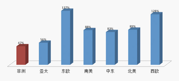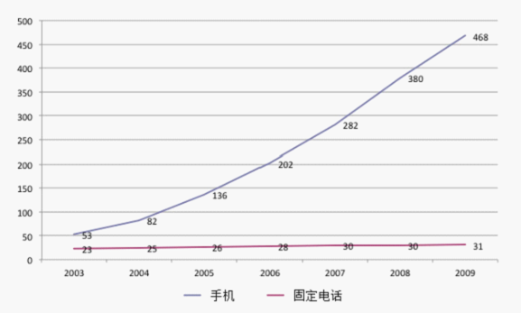 手机是从上世纪90年代后期开始在非洲出现的,相对于固定电话,手机的购买成本较低,尤其是随着低价位手机以及二手市场的涌现,非洲各国的国民都可以轻易购买到手机,从而使手机在非洲地区得以快速普及。2000年,非洲的手机保有量超过了固定电话数量,此后有一段时间的年平均增长率超过40%,显现出惊人的增长速度。2009年末,非洲固定电话数量共有3,100万(普及率16%),而手机用户数达到了4.68亿(普及率47%)(图6)。