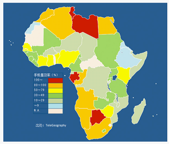 非洲北部以及西部是属于手机普及较早的地区,非洲60%以上的用户集中在这些地区。同时,从国别来看,阿尔及利亚、埃及、加纳、摩洛哥、南非、突尼斯、刚果阿等国较为突出。