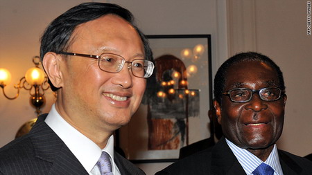 资料图片:中国外交部长杨洁篪今年2月11日访问津巴布韦时与津巴布韦总统穆加贝(Robert Mugabe)合影。