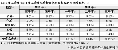 与发达经济体相比,2011年主要新兴经济体经济增长前高后低的态势格外显著。具体来看,2011年前三季度,中国经济分别同比增长9.7%、9.5%和9.1%;印度经济分别同比增长7.8%、7.7%和6.9%;巴西经济同比分别增长4.2%、3.1%和2.1%;南非经济同比增长3.5%、3.0%和1.4%。参见下表: