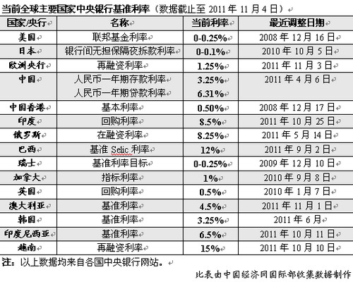 2011年世界经济出现的一个最明显特征是发达工业国家与发展中新兴经济体出现了完全不同的情况。发达工业国家普遍经济增长速度较低同时也保持着物价水平的基本稳定,相比之下,发展中国家尤其是新兴经济体则普遍面临着比较严重的通货膨胀。这些国家虽然官方公布的增长速度很高,但消费者价格指数涨幅也很惊人。为了遏制通货膨胀发展中新兴经济体普遍采取了比较高的利率,而发达经济体则因为没有通货膨胀的担心普遍实行超低利率政策。参见下表: