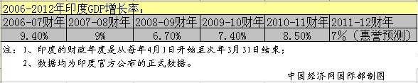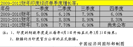 印度经济增幅从金融危机爆发前连续三、四年的高增长一度降至2008财年的6.7%,在财政刺激措施等因素推动下,随后两个财年经济增幅分别提高至7.4%和8.5%。从目前情况看,本财年印度经济增幅可能仅略高于7%,下财年增幅仍有可能处于这一水平,经济再提速估计要到2013财年。
