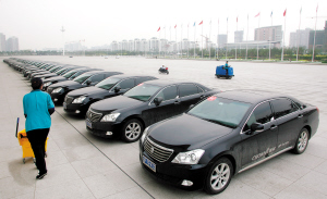 2010天津夏季达沃斯论坛首批20辆“丰田皇冠”工作用车驶抵梅江会展中心前广场,近日,还将有其他工作车辆陆续抵达,服务达沃斯论坛。摄影记者 钱进