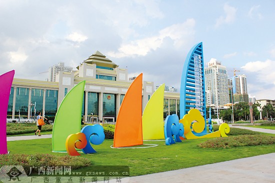 当天,在民族广场,记者看见广场临近民族大道处左右两侧各设置了别致的景观,如同正在广阔海面上扬帆疾行的帆船,船底激起朵朵浪花。这组小品名叫“风行万里”,寓意“泛北”合作将长期持续,前途广阔。