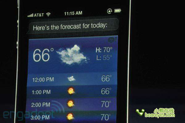 用户只需要按住home键,Siri语音辅助功能就会聆听指令,比如该功能可以帮助用户阅读短信内容,并且进行语音回复。还比如,你说今天天气怎样?iPhone 4S就会回答目前天气预报。此外,语音功能配合网络信息,还能为用户提供例如附近餐厅、语音搜索、事件提醒等等信息的推送,当然前提条件也是你要对着iPhone说话才行,而且需要讲的是英语、法语或德语的其中一种(目前)。