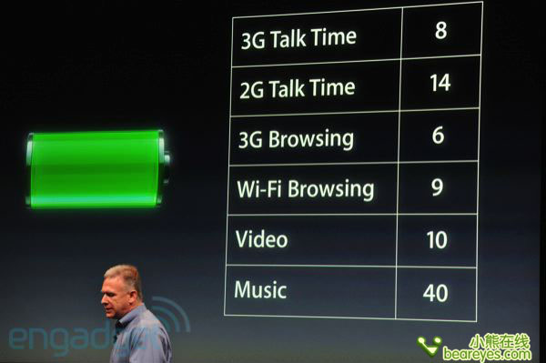 另外,虽然使用了双核心处理器,但是A5处理器优秀的功耗控制,使得iPhone4S在电池续航能力上较上一代略有提升。同时发布会现场还为媒体演示了极端3D游戏的视频处理,可看出新的iPhone 4S在整体性能上的进步。
