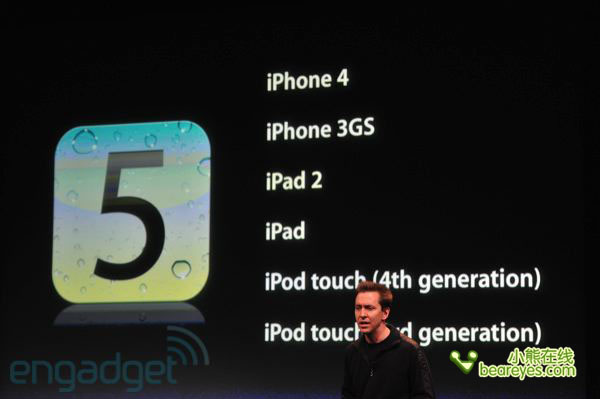 另外苹果还对iOS 5所支持的设备进行了说明,新的iOS 5将可支持iPod touch 3、4,iPad 1、2,iPhone 3GS、4、4S共7款设备。