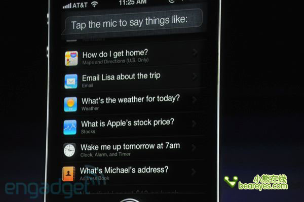 此次发布会上,苹果给iPhone 4S带来的最大亮点功能就是下面要介绍的Siri语音辅助功能了。新的语音辅助功能可以让你摆脱触控手机的操作了,现在只需要对着iPhone说话就可以完成大量的工作或功能实现。