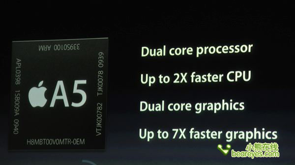 据发布会上苹果高层详细解说,iPhone 4S采用与iPad2相同的A5双核心处理器,在运算性能上较iPhone4有了成倍的提升。而新一代双核心图形处理器的加入,则使得iPhone4S的图形处理速度达到了前一代的7倍。