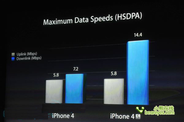 据现场介绍,iPhone 4S采用新天线系统,用户可切换两种天线,选择更好的通话质量或者下载速度。理论上,iPhone 4S的最大下载速度为14.4Mbps,而iPhone 4最大下载速度为7.2Mbps,两款手机的上传速度都为5.8Mbps。