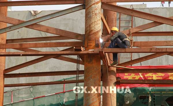 5月17日,在大冲邕江特大桥施工现场,一位工程人员正在施工作业。大冲邕江特大桥跨越邕江和湘桂铁路,桥梁全长888米,主桥跨最大单孔跨度332米,是目前广西单孔跨度最大的大桥。
