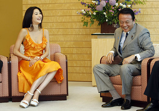 麻生15日上午在官邸接见了今年的世界小姐选美大赛日本选手宫坂绘美里。