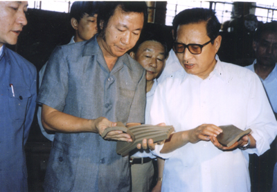 1983年,印华地砖厂是由华商陈应登先生独资创办的、是厦门特区的第一家外资企业。图为陈应登先生向全国人大委员长乔石介绍企业产品