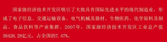 国家级经济技术开发区吸引了大批具有国际先进水平的现代制造业,形成了电子信息、交通运输设备、电气机械及器材、生物医药、化学原料及制品、食品饮料等产业集群。2007年,国家级经济技术开发区工业总产值38426.28亿元,占全国的7.47%。